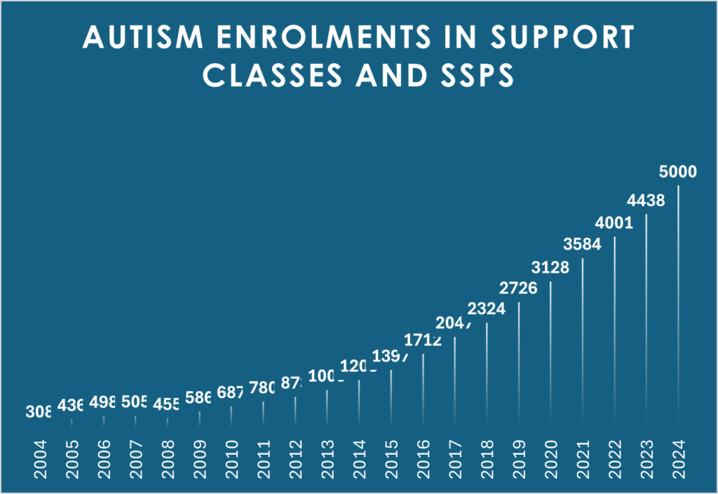 The Centre for Education Statistics and Evaluation (CESE) data (Figure 3) highlights the upward trend of 1,523% enrolment increase of students with autism in our support classes and schools for specific purposes (SSPs) across the last 20 years. This information demonstrates an important need for the profession to look at ways to support this group of students (and the teachers) across school settings to better meet the individual needs of all students.